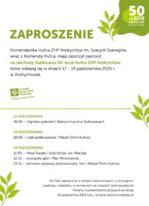 Rok 2025 to dla nas, andrychowskich harcerek i harcerzy, wyjątkowy czas – obchodzimy pół wieku działalności pełnej przygód, służby i harcerskiego ducha. To pięć dekad, podczas których Hufiec ZHP Andrychów stał się istotną częścią lokalnej społeczności, wychowując kolejne pokolenia młodych ludzi.
