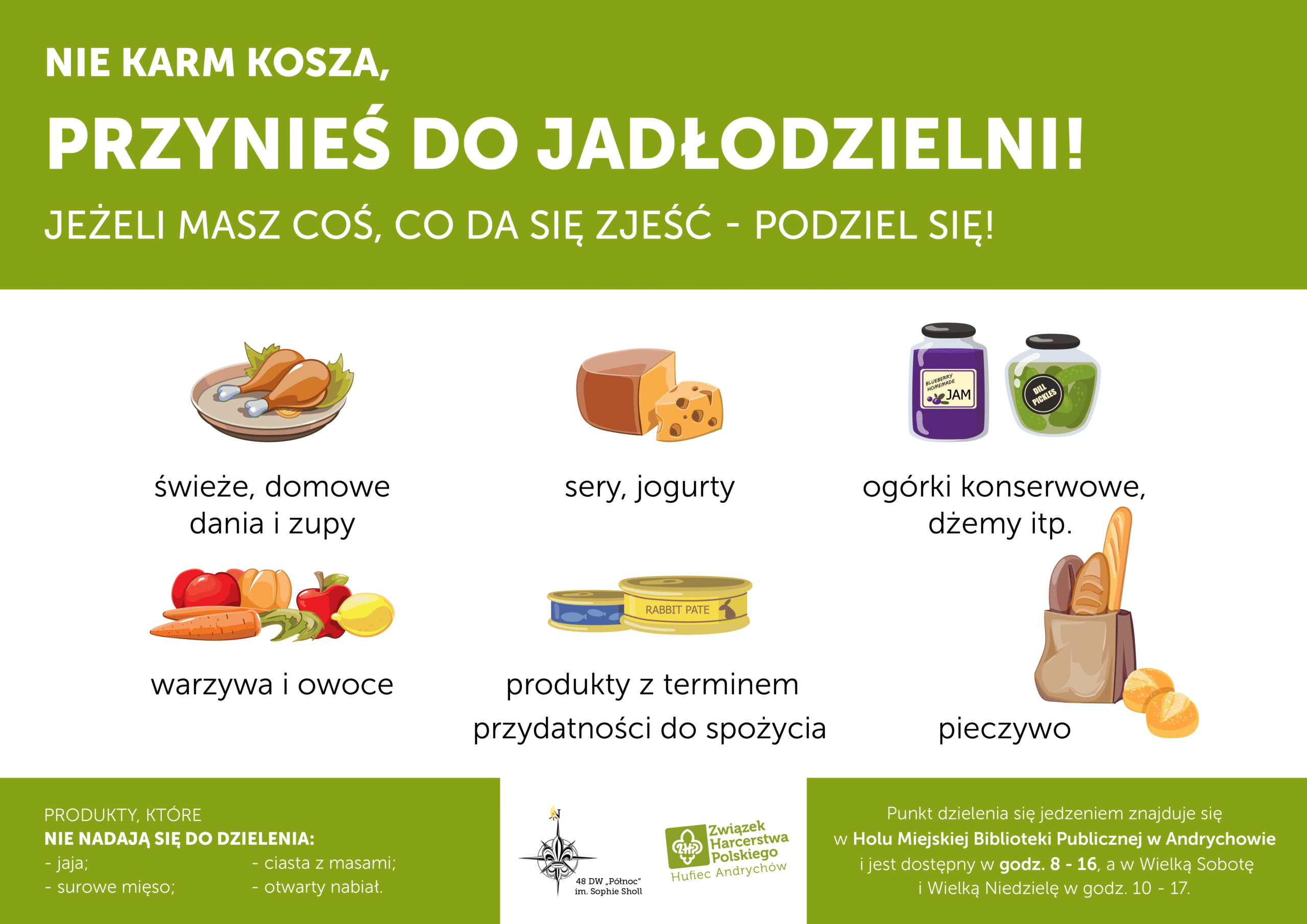 W odpowiedzi na potrzeby społeczności lokalnej, dzięki staraniom 48 DW Północ z Hufca ZHP Andrychów, przy współpracy z Gminą Andrychów, w Andrychowie startuje kolejna edycja akcji „Nie karm kosza, przynieś do jadłodzielni”.